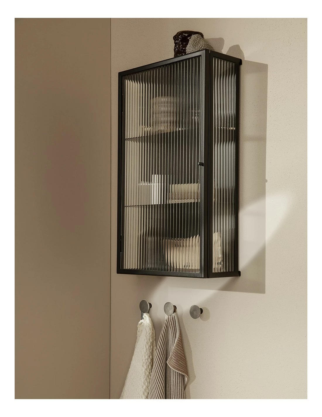 Haze Wall Cabinet, Aparador de estructura metálica y cuerpo de cristal de estética industrial de Ferm Living
