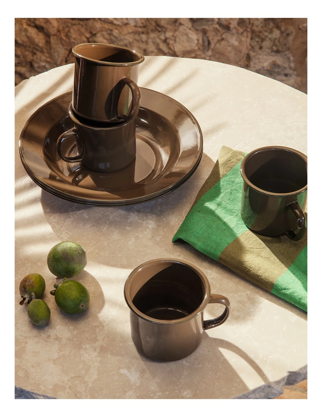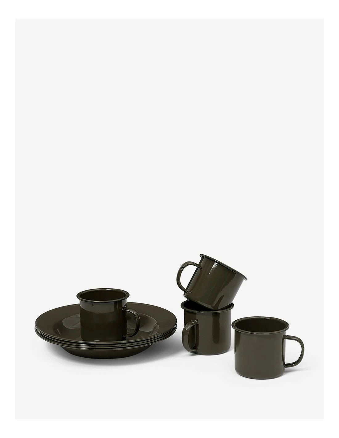 Este juego de platos y tazas esmaltadas es el aliado perfecto para disfrutar de pequeñas escapadas al aire libre.