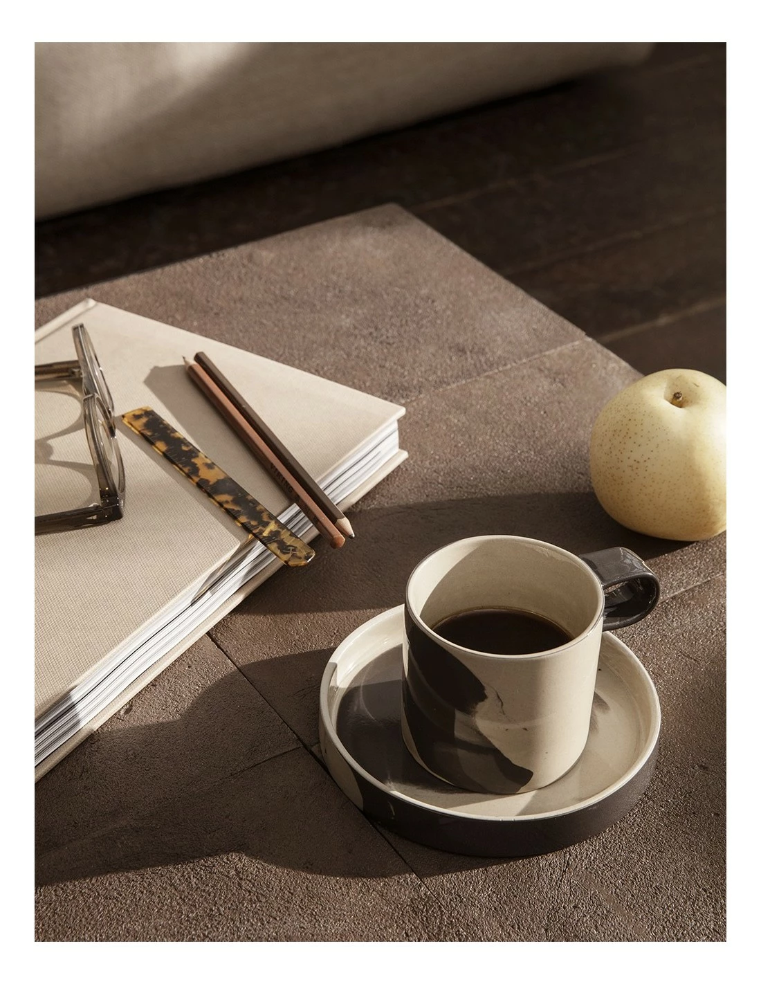 Inlay de Ferm Living juega con proporciones atrevidas y un diseño bicolor dando como resultado una taza elegante y práctica.