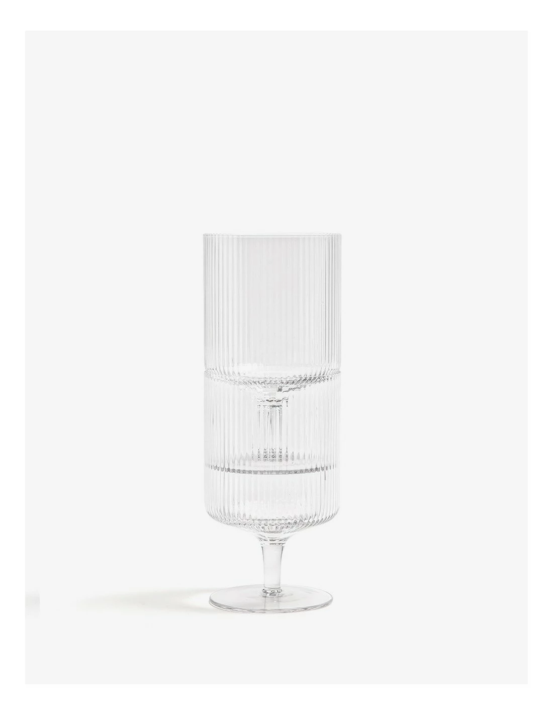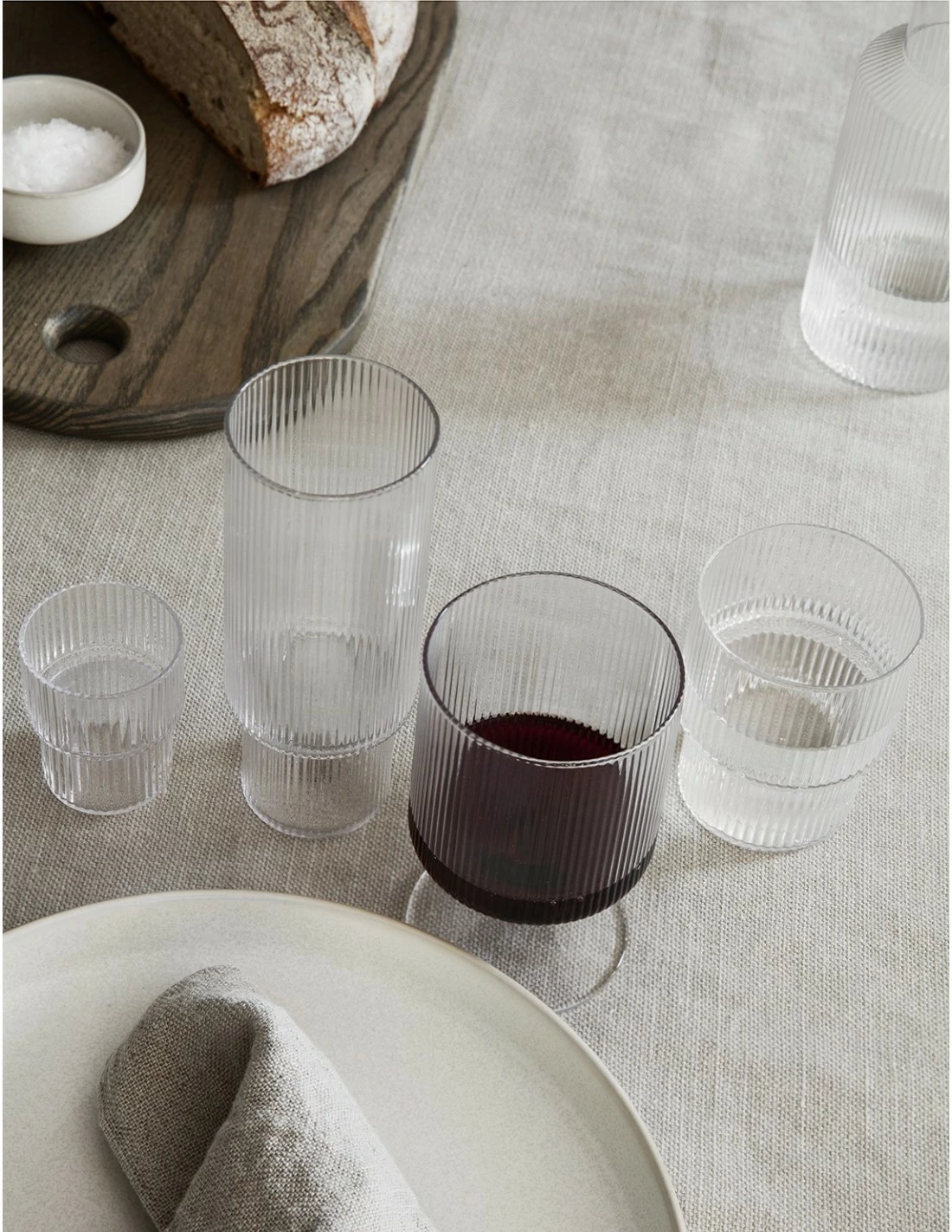 Set de vasos apilables soplados en molde con diseño de ondas en la superficie.