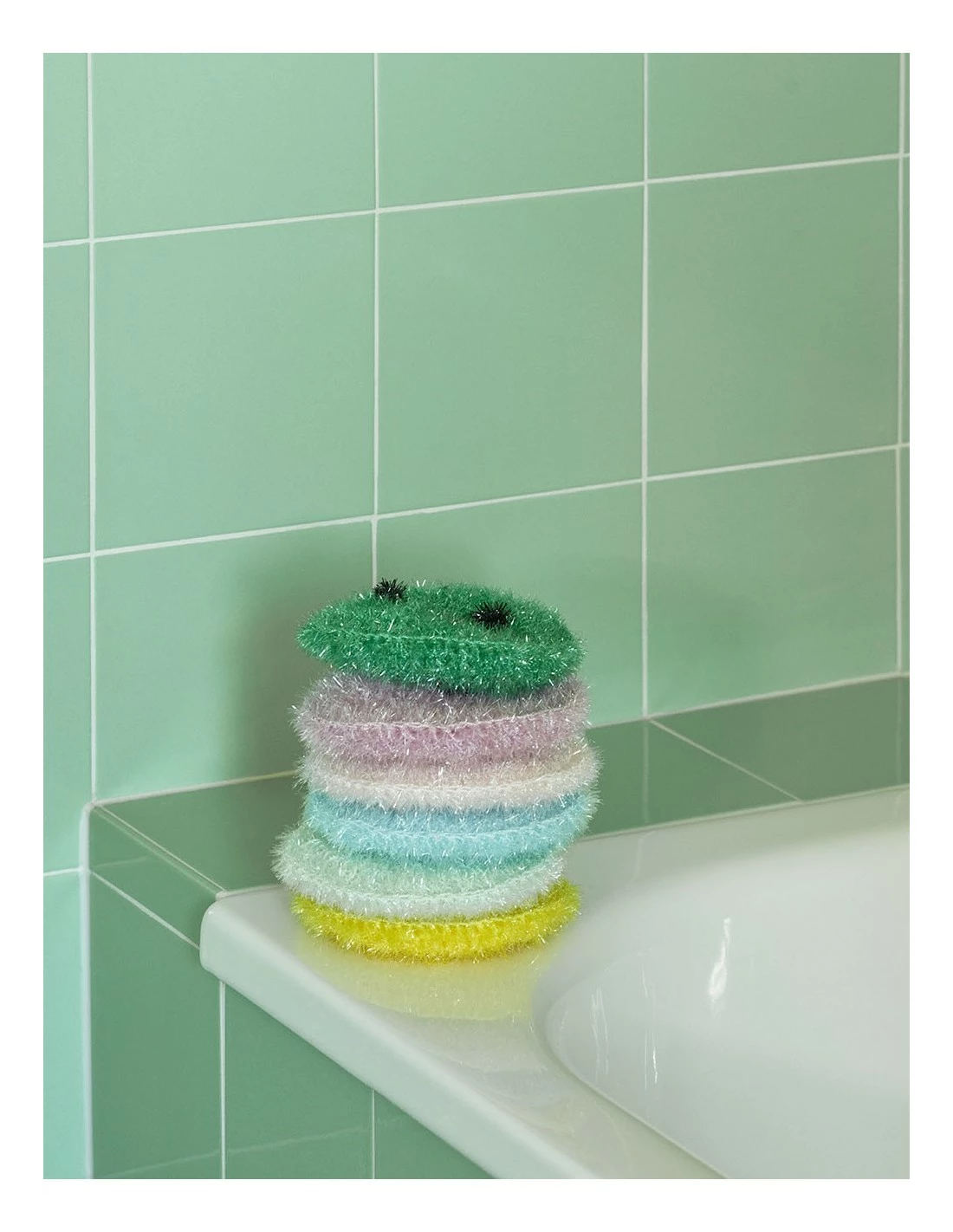 Esponja de baño realizada en poliéster con diseño de cara sonriente y diseñada por Connie Hüsser