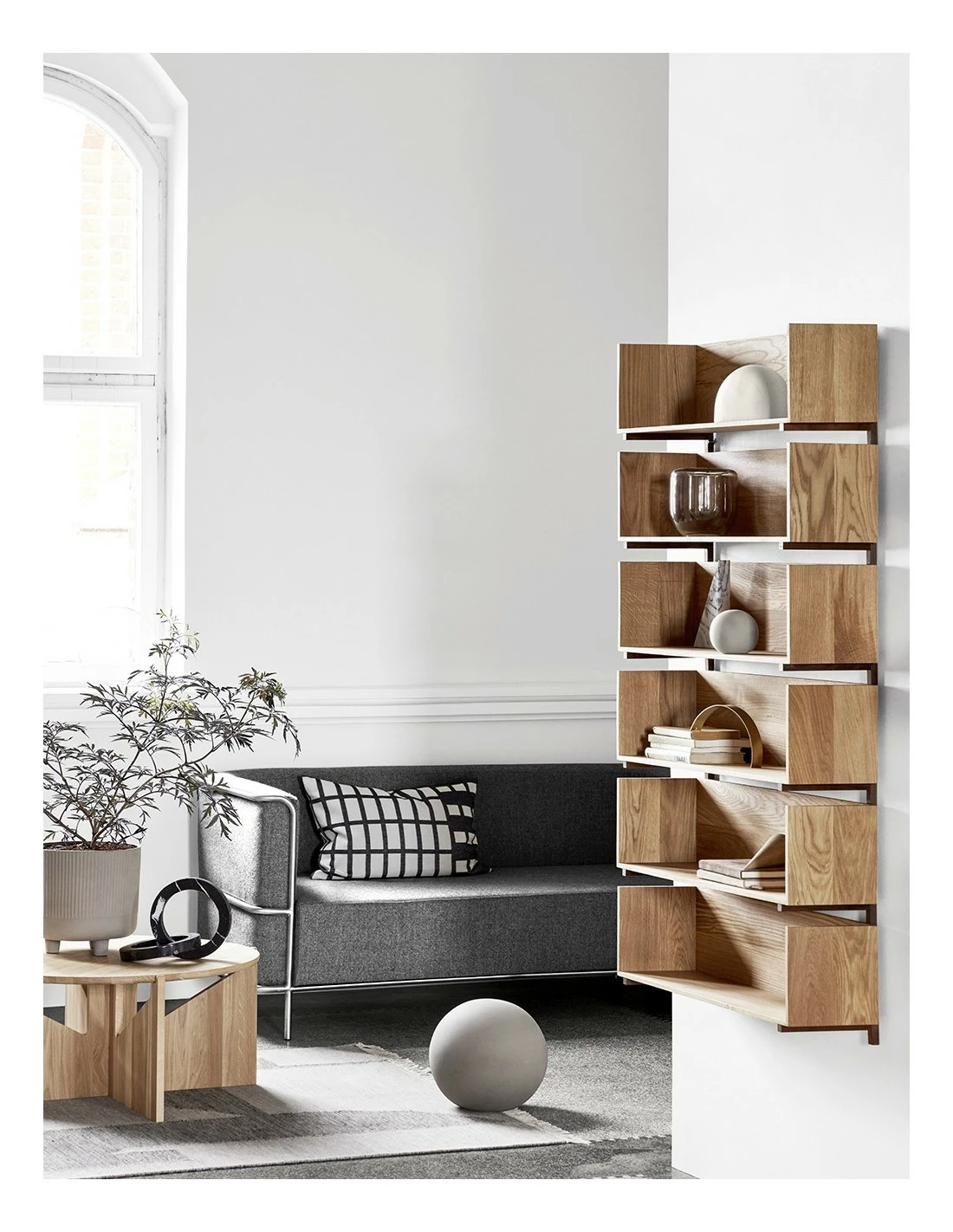 Sistema de estantes de roble macizo y nogal con diseño de líneas minimalistas
