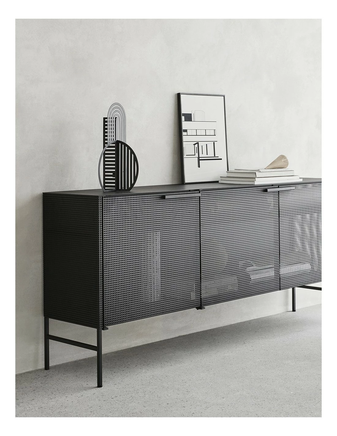 Aparador de estilo nórdico minimalista, realizado en chapa de acero perforada en forma de cuadrícula