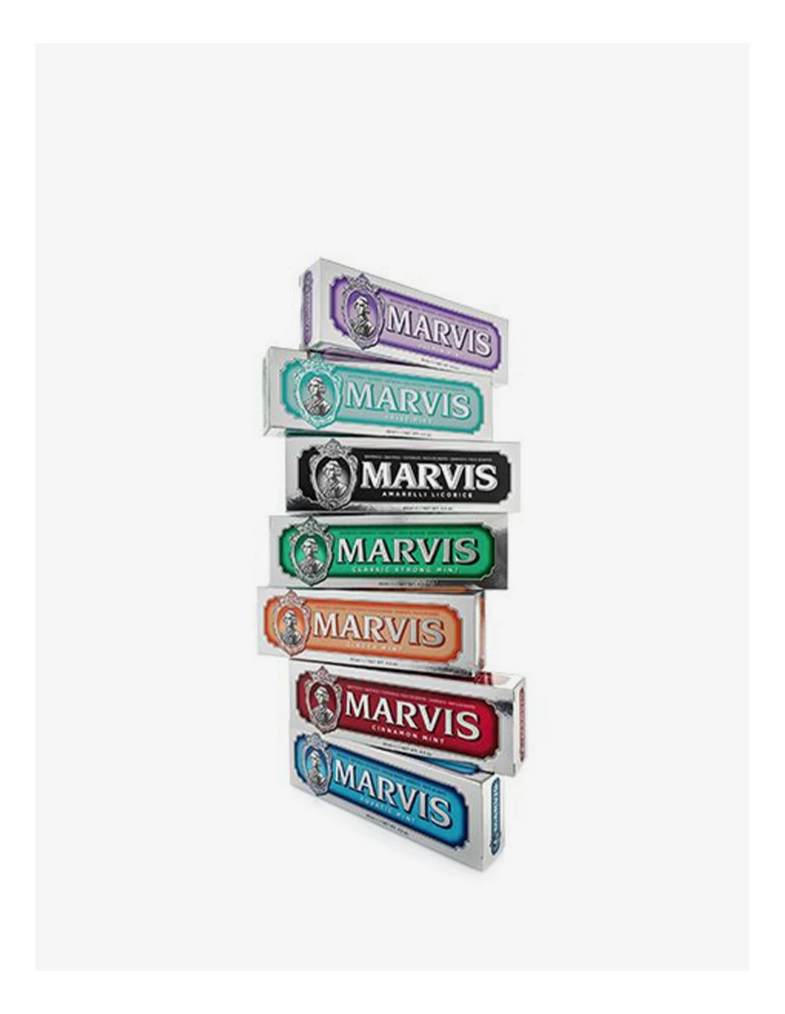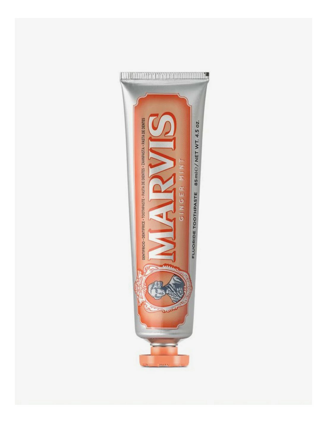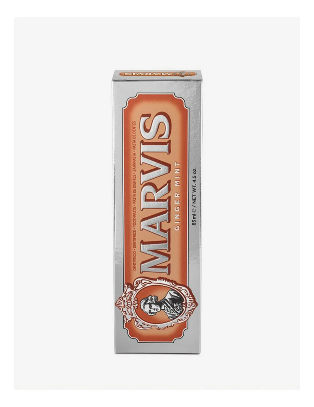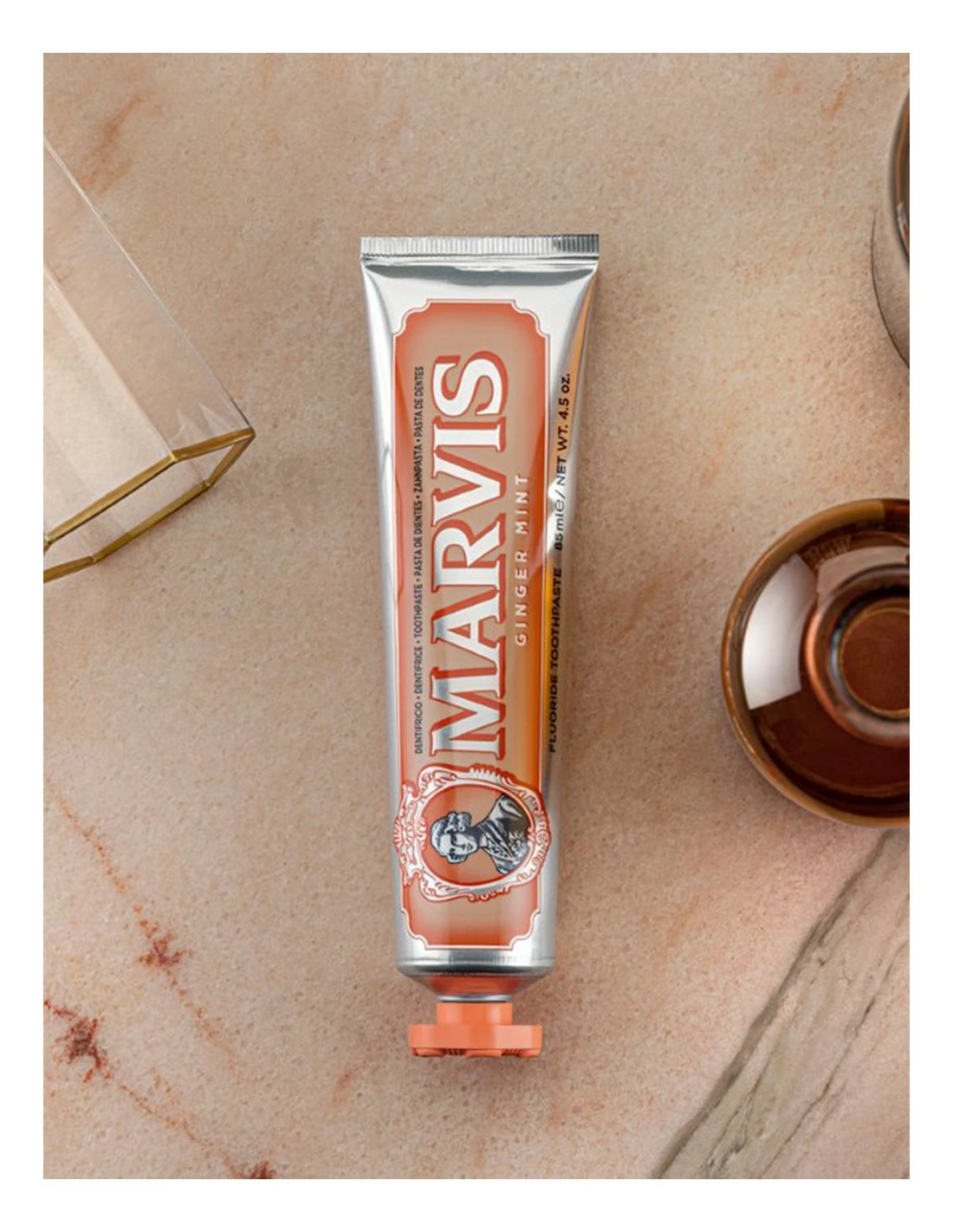 Marvis Ginger Mint con sabor jengibre te ofrece una sensación intensa de sabor eliminando la placa para un sonrisa blanca y brillante.