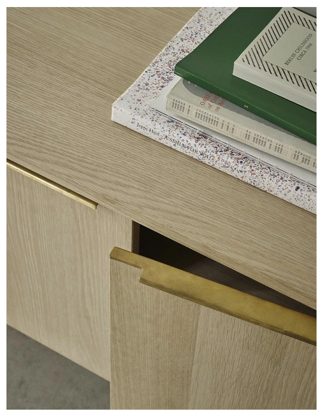Aparador de estilo minimalista de Skagerak realizado en roble con tapa de roble o mármol. En el interior del gabinete cuanta con tres espacios, dos divididos por baldas.
