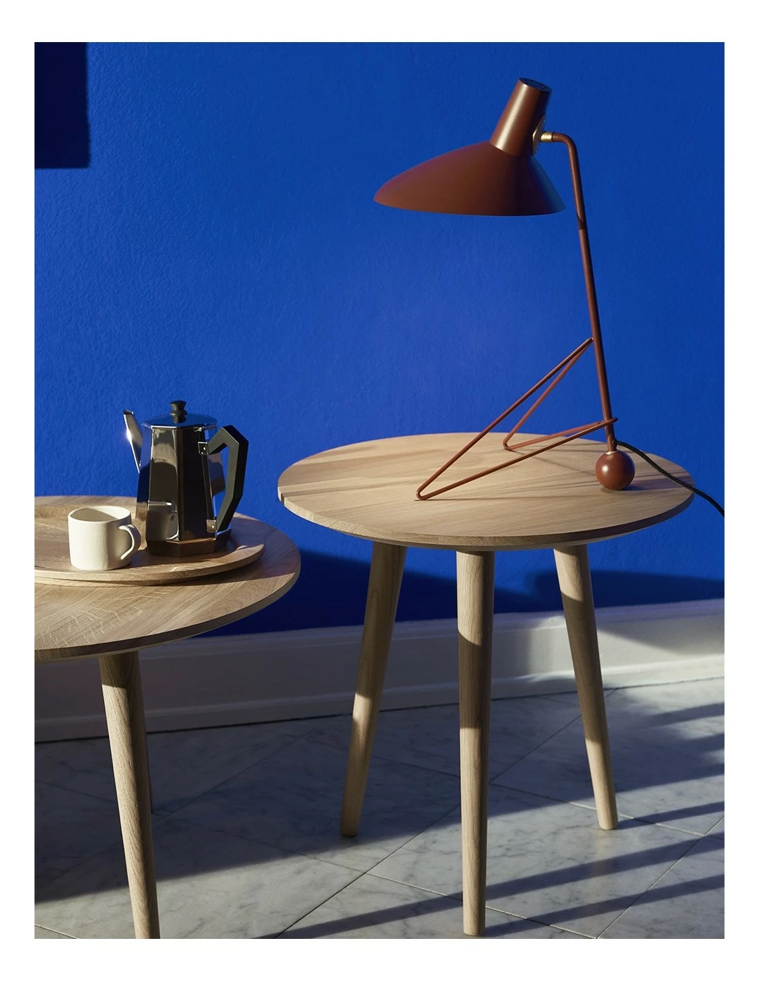 Las patas de esta mesa se realizan a partir de madera maciza de roble mientras que su tablero se realiza con un resistente núcleo de MDF terminado en roble.