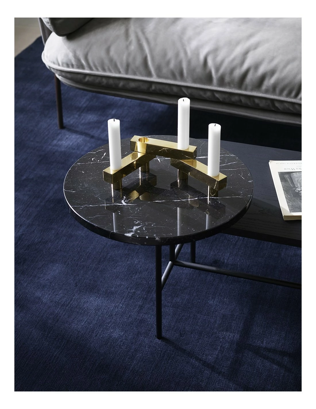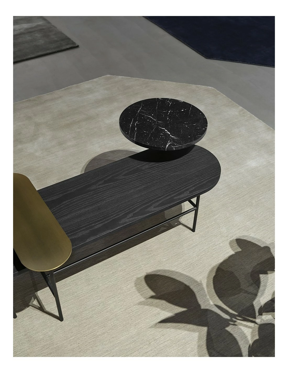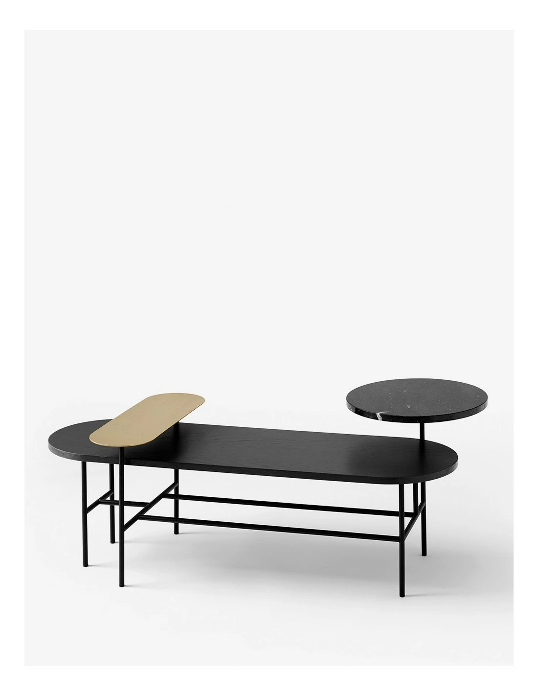 Mesa de &Tradition compuesta por tres tapas superpuestas de madera, mármol, y latón