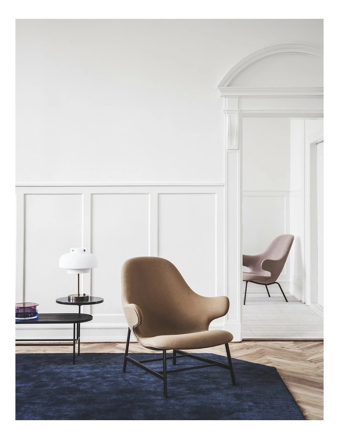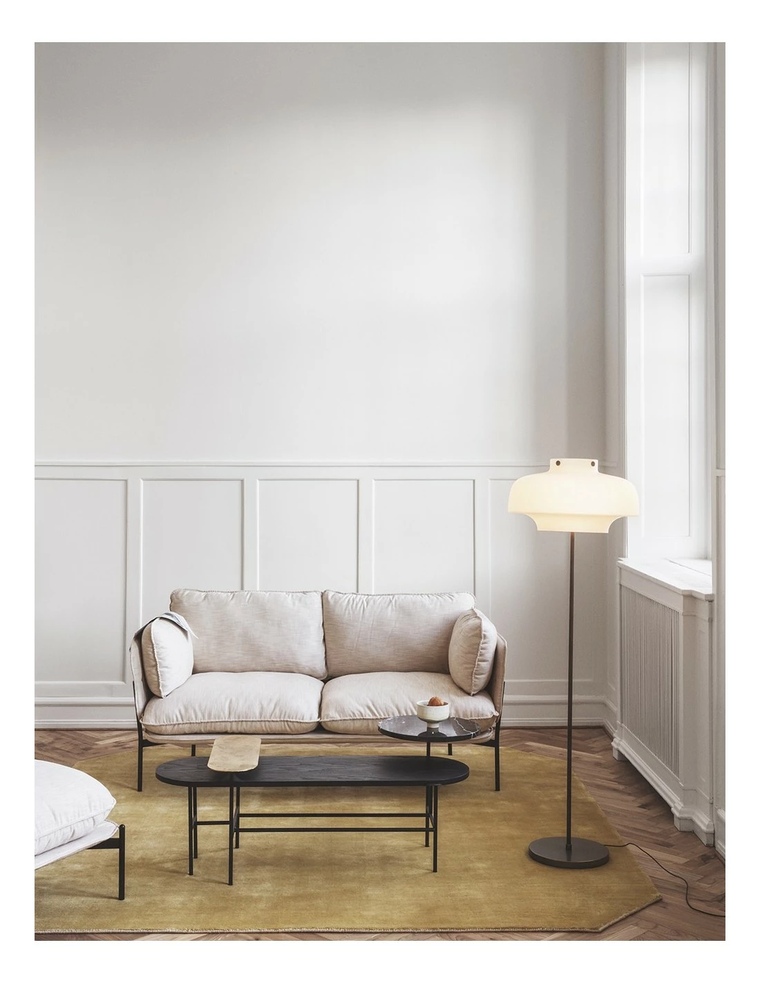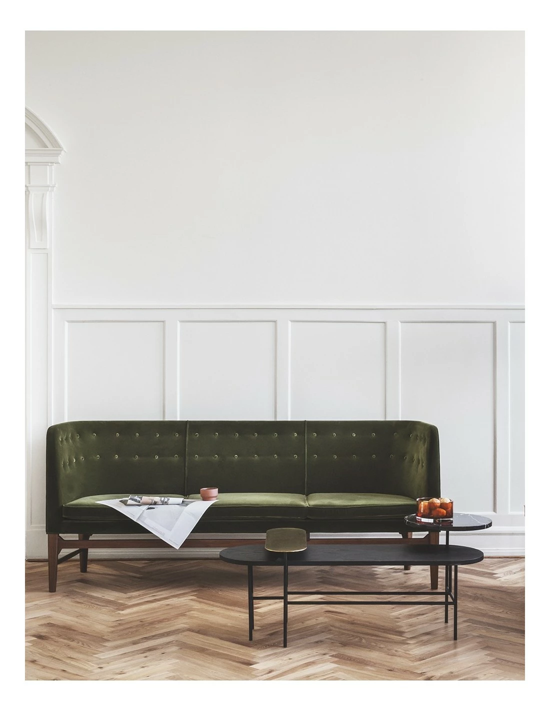 Mesa de &Tradition compuesta por tres tapas superpuestas de madera, mármol, y latón